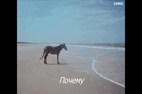 A lone horse stands on a sandy beach as ocean waves gently wash ashore, with the contemplative question 'Why'.