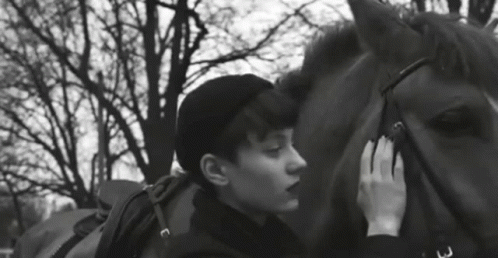 A woman gently pets a horse in a black and white scene, showing a tender moment.