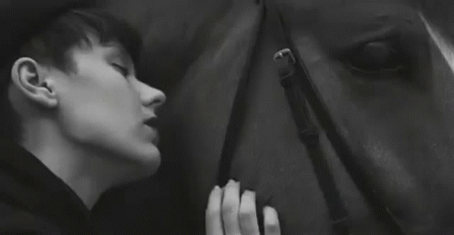 Ukrainian singer and composer Dakooka gently pets a horse in a black and white scene, showing a tender animal bond.