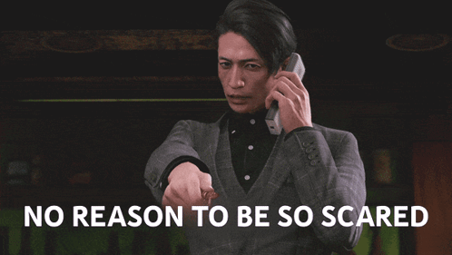 Kazuki Soma (voiced by Hiroshi Tamaki) from Lost Judgment, on the phone, pointing and saying 'No reason to be so scared'.