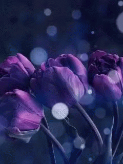 A beautiful animation of vibrant purple flowers, possibly tulips, shimmering with sparkling light effects.