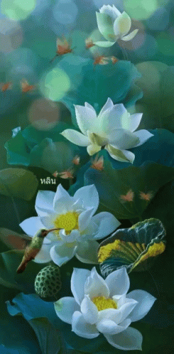 A serene animated scene featuring white lotus flowers with yellow centers, small fish, and a hummingbird.