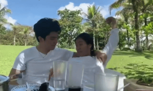 Loudre shares a cute and playful hugging moment outdoors, surrounded by lush greenery and palm trees.