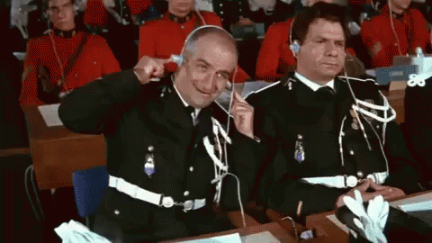 Louis de Funès comically struggles with his headphones during a formal event, trying to get them to work.