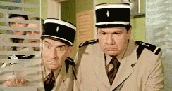 Louis De Funès and a fellow gendarme peek from behind blinds, followed by gendarmettes reading magazines.
