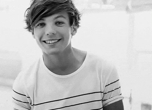 Louis Tomlinson flashes a charming smile in a black and white portrait, wearing a striped t-shirt.