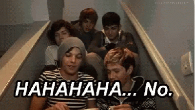 Louis Tomlinson and One Direction members laughing and reacting with a 'HAHAHAHA... No.' caption.