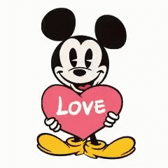 Mickey Mouse holds a pink heart with 'LOVE' written on it, expressing affection.