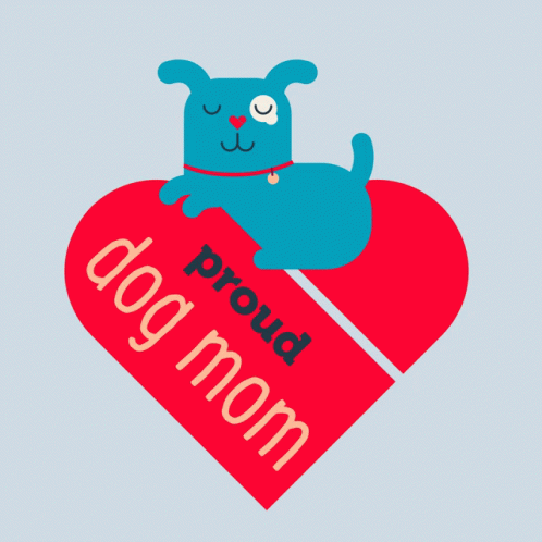 A cute blue cartoon dog with a red collar lies on a red heart that reads 'proud dog mom'.