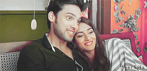Parth Samthaan and Erica Fernandes as Anupre, a loving couple, laughing and embracing on a couch.