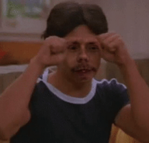 A man with a mustache, known as Love Fez, makes a distinctive hand gesture, possibly expressing thought or surprise.