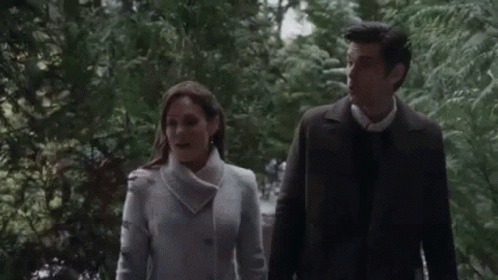 Elizabeth Thornton (Erin Krakow) and Mountie Nathan Grant (Kevin McGarry) enjoy a happy conversation in a snowy forest.