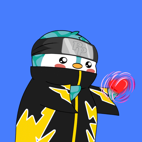 Animated Pudgy Penguin with a headband and a big red heart, expressing love and happiness in a vibrant scene.