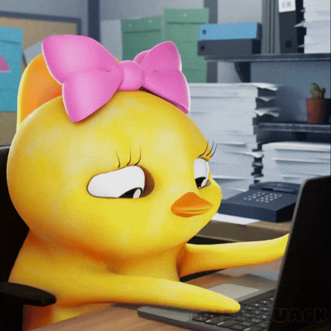 Lola, the cartoon chick with a pink bow, types on her laptop, then reacts sweetly to a floating heart.