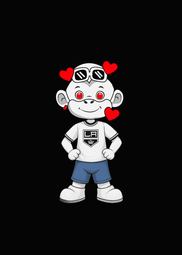Zhot Jr, the white cartoon monkey, wearing an LA Kings shirt, sunglasses, and surrounded by hearts.