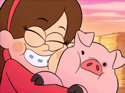 Mabel from Gravity Falls joyfully hugs her beloved pig, Waddles, with a big smile and braces.