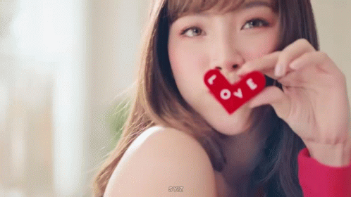 Thai actress Baifern Pimchanok holds a red heart with 'LOVE' written on it, looking playfully at the camera.