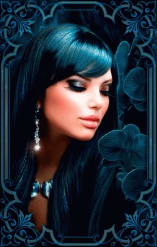 Elegant woman with long blue hair, dark makeup, and a necklace, framed by blue floral designs.