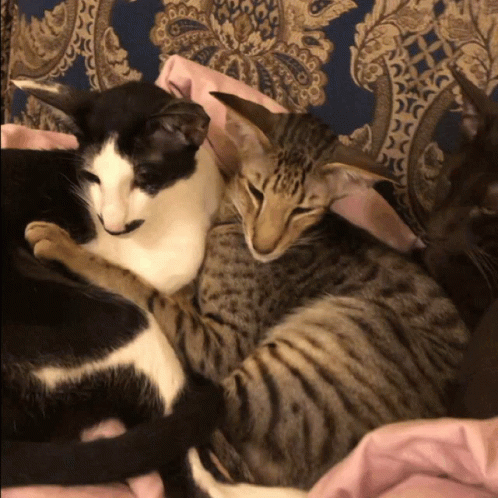 Two adorable cats cuddling on a bed with a blue paisley background, showing affection.