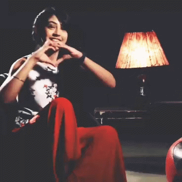 Niti Taylor makes a heart gesture with her hands, claps, and smiles warmly, expressing love and affection.