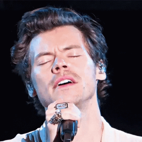 Harry Styles performing live during his Love On Tour 2021, singing passionately into a microphone.