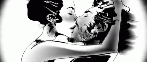 A romantic black and white animated drawing of a man and woman kissing, continuously rotating.