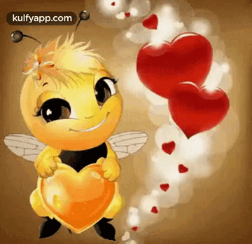 A charming cartoon bee holds a heart, surrounded by floating red hearts, spreading love vibes.
