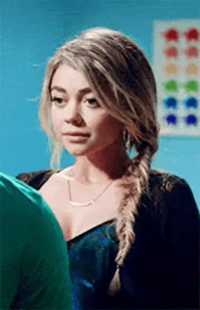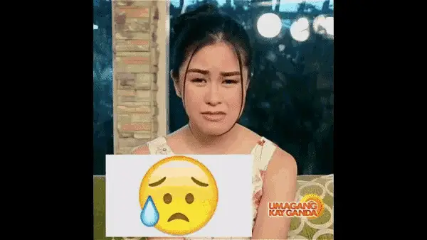 Girl in red hat blowing kisses while sitting on a red 'Besitos' sign.