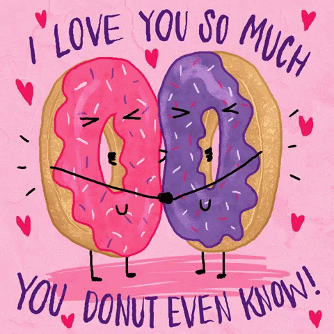 Two adorable animated donuts, one pink and one purple, hug with the sweet message 'I Love You So Much, You Donut Even Know!'