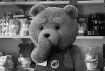 A charming teddy bear, wearing a 'HELP' apron, blows a flying kiss in a store aisle.