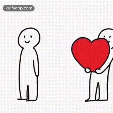 Two simple cartoon figures, one offering a large red heart to the other, symbolizing love and affection.