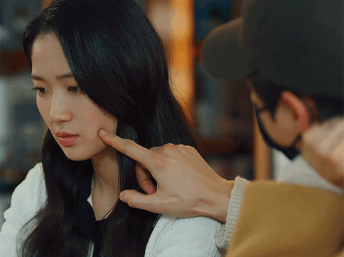 In Lovely Runner, a man tenderly touches a woman's cheek, creating a sweet and intimate moment.