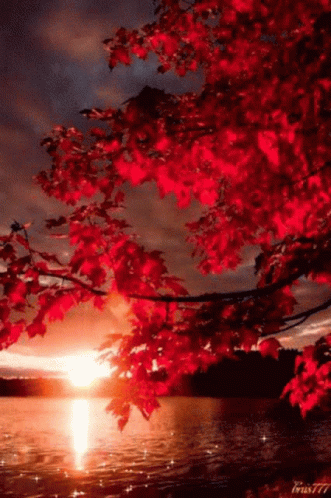 A stunning sunset over water, framed by vibrant red autumn leaves. A truly beautiful day by Lovinlinda.