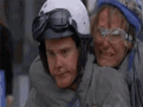 Two men wearing helmets and goggles are seen smiling, possibly in a humorous or ironic context.
