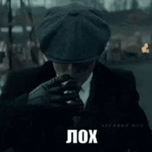 A man in a suit and hat with the Russian word 'ЛОХ' (loser) displayed on the screen.