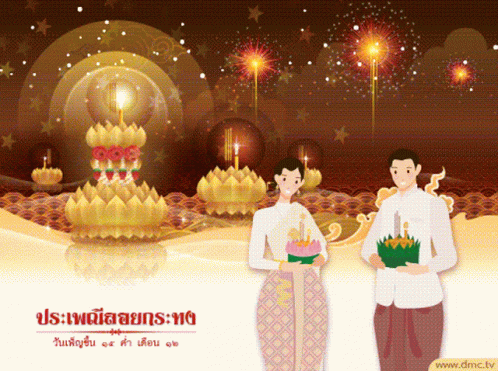 Animated scene of the Loy Krathong festival with a man and woman holding krathongs, fireworks, and traditional decorations.