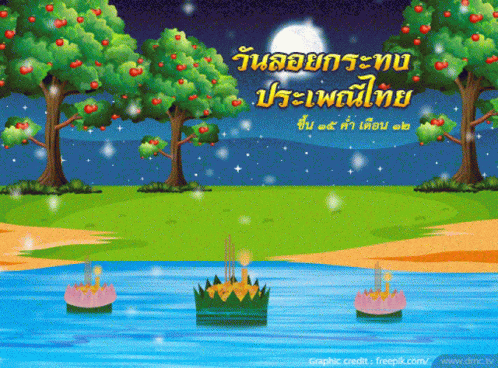 Animated scene celebrating Loy Krathong, a Thai tradition, with krathongs floating under a full moon.