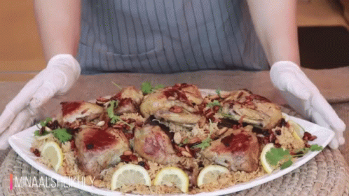 Mina Alsheikhly presents a delicious and beautifully garnished chicken and rice dish, a perfect recipe.