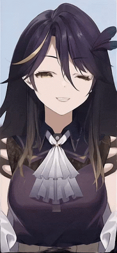 a girl with long purple hair is smiling and wearing a black top
