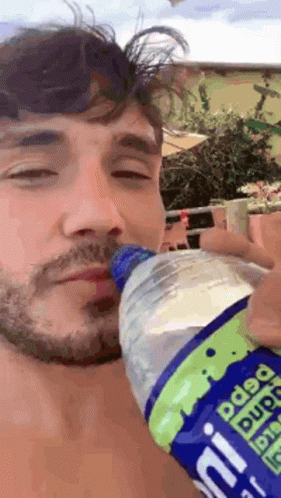 Lucas Viana takes a refreshing drink from a water bottle, staying hydrated outdoors.