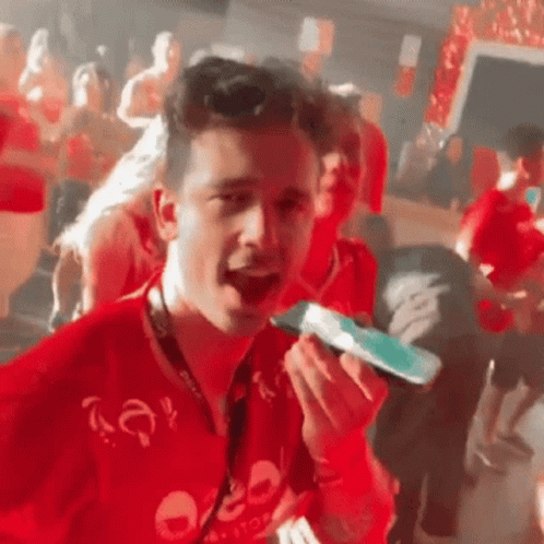 Lucas Viana and Kaique Luiz having fun at a lively party, with Lucas on a phone call.