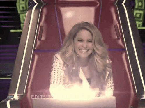 Lucero reacts with joy and dances excitedly in her judge's chair on a TV show set, showcasing her vibrant personality.