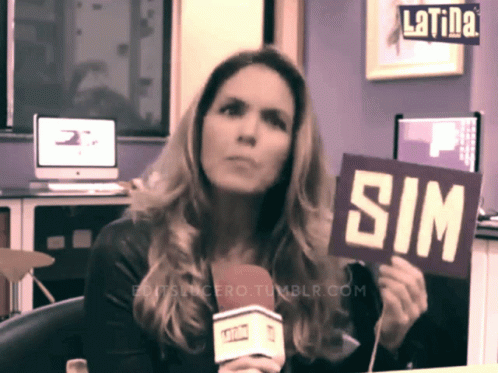 Lucero shaking her head while holding a sign that changes from 'SIN' to 'SIM', indicating agreement.