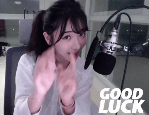 Jinnytty smiles and gestures, wishing "Good Luck" to viewers from her streaming setup.