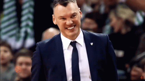 Basketball coach Sarunas Jasikevicius, also known as Lucky D, smiles and points during a game.