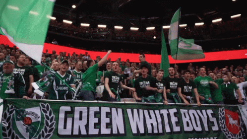Lucky D Green White Boys fans cheer passionately at a Zalgiris Kaunas basketball game, displaying their banner.
