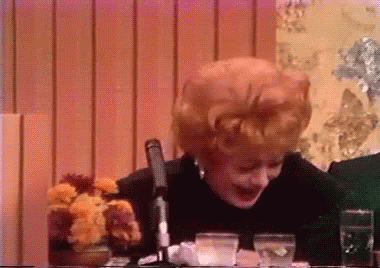 Lucille Ball, known as Lucy, captured in a moment of her iconic, boisterous laughter at a table with a microphone.