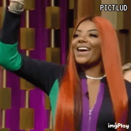 Ludmilla, with long orange hair, waves and blows a kiss to the camera in front of a purple background.