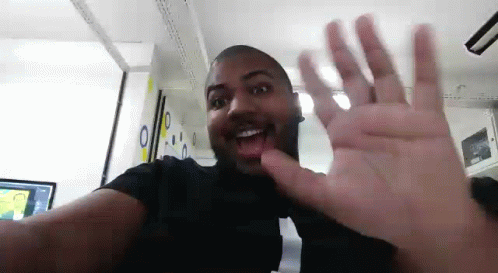 Lufe, a man with a beard, takes a happy selfie, waving his hand in a brightly lit room.