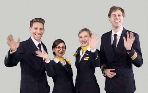 Lufthansa Group pilots and cabin crew wave and smile, welcoming viewers.